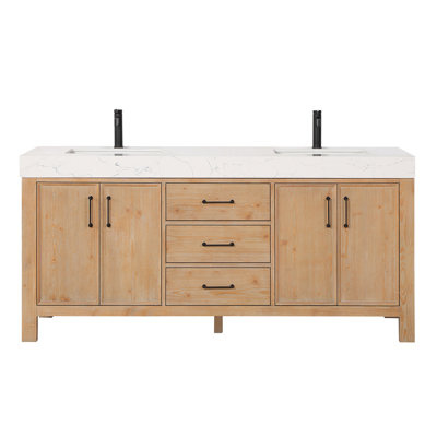 Create an accountThis classic vanity set brings French country style and plenty of drawer space to your main bathroom or guest bath. Its wide frame is made from solid wood with a natural, weathered finish, and its surface is crafted from composite stone for an elegant design. The under-mount sink(s) are made from ceramic and boast a rectangular silhouette. This vanity comes with soft-closing drawers and metal handles that open to reveal space for washcloths, toothpaste, and hair ties. The soft-close doors hide extra shelf space for hairdryers, while an open shelf is ideal for bath towels. Plus, this bathroom vanity has a chamfered water-retaining edge on the counter that prevents dripping on the floor.
