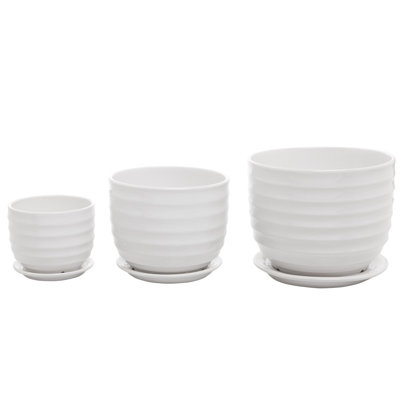 Create an accountAdd lush greenery to your home decor with these white ceramic flower pots. These ceramic planters are perfect for displaying flowers, herbs, and small plants, and are small enough to display on your desk, kitchen counter, coffee table, or patio. Use all 3 planters to form a lovely centerpiece on your dining table, or use them separately to bring a modern style all across your home. Featuring a ribbed exterior and a drainage hole to simplify plant maintenance, these plant pots are both stylish and practical.