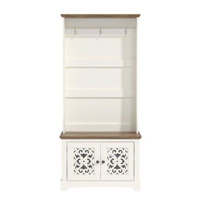 Create an accountElevate your entryway with the Traditional Hall Tree that doubles as a coat rack, where timeless style meets everyday practicality. Decorative cut-out doors with acrylic mirror accents and round metal knob handles create an elegant focal point. Three hooks hold up to 6.6 lbs each for coats and accessories, while two adjustable shelves support 11 lbs each for flexible storage. The smooth bench surface supports 225 lbs, offering a comfortable seating spot. Two concealed doors keep essentials neatly tucked away, maintaining a clutter-free look. A wall anchor adds stability, and illustrated instructions ensure hassle-free assembly. Available in white, black, brown, and beige finishes.