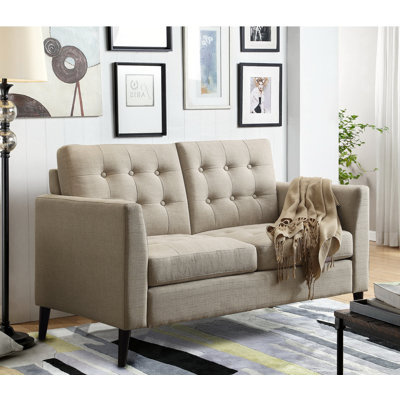 Create an accountPerfect for rounding out a seating ensemble or a space-conscious area with a lounge-worthy touch, loveseats like this are a great option for all the comfort of a sofa without dominating your home's square footage. Crafted from a solid wood frame wrapped in 100% linen, this piece features a clean-lined silhouette perfect for a contemporary look. Tapered wood legs with a dark espresso finish and button tufting around this piece out with a touch of mid-century style.