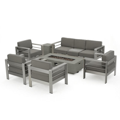 Create an accountThis seating group creates a casual lounge setup that is great for unwinding and gathering with guests in your outdoor space. It includes a deep-seated sofa and coordinating chairs designed with open aluminum frames for a modern, airy silhouette. A central fire pit provides a functional focal point that offers warmth during cool evenings, while the included cover helps protect the table surface when not in use. Removable cushions with soft-toned fabric covers offer a comfortable place to relax. We also love that the zippered covers are machine-washable for easy upkeep.
