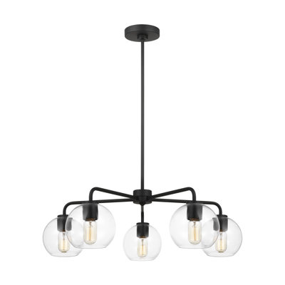 Create an accountSputnik sensation. Our 5-light chandelier boasts a modern, statement-making design inspired by the iconic Sputnik silhouette. The steel frame features an adjustable length, making it just right for various ceiling heights, while the clear glass shades cast an ambient glow throughout your space. Plus, it's sloped ceiling compatible for even more versatility. With its linear layout and transparent glass, this chandelier is a true conversation starter. Hardwired and damp location listed.