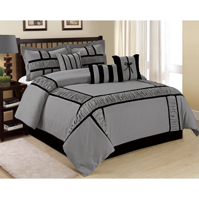 Create an accountThis traditional 7-piece comforter set makes a statement in your bedroom. Made from 100% hypoallergenic polyester in a faux silk finish, this set includes a comforter, two pillow shams, an accent pillow, and a bed skirt. Ruched panels with clean edging create dimension and a classic look on the comforter and pillow shams, while stripes and bow details adorn the throw pillow. A polyester filling creates a pillowy texture for maximum comfort on your master or guest bed. Plus, the set is machine washable for easy care.