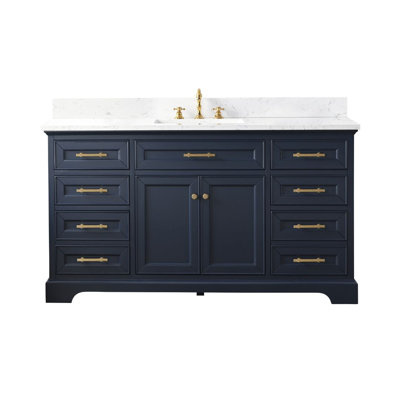 Create an accountThis single-bathroom vanity set features clean lines and plenty of drawer space for all your makeup, toiletries, and cleaning supplies. Its wide 60" design is made from solid and manufactured wood in a neutral finish, and its surface is crafted from engineered stone in a Carrara white finish that complements your contemporary decor. The included undermount sink is made from ceramic, and it boasts a rectangular silhouette. Eight indented drawer fronts come with handles and they open up to reveal space for washcloths, toothpaste, and hair ties. And the two matching doors with rounded knobs hide extra shelf space for hairdryers and bath towels. Plus, this bathroom vanity comes with a backsplash to help protect your walls.