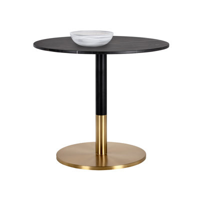 Create an accountA round bistro table inspired by Art Deco luxury. Features a matte black marble top with striking gold and white veining and a black and gold steel base. Perfect for small kitchen and dining spaces. As marble is a natural material, unique veining, pitting, fissures, micro-cracks and color variations are all characteristics that add to the uniqueness and beauty of each piece.
