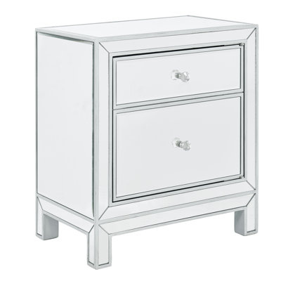 Create an accountThis nightstand fills your bedroom with glam style and gives you a spot to keep an accent lamp and reading material nearby. It's crafted from solid and engineered wood and features a streamlined silhouette with mirrored paneling for an eye-catching look in your space. One door with a crystal knob opens to reveal a cabinet that offers two shelves of additional storage space for tucking away loose odds and ends. At 21" wide, this bedside table has a small footprint and works well as an end table in your living room or den. No assembly is required.