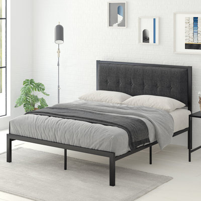 Create an accountLatitude run full-size bed frame with strong metal slats, platform bed frame with upholstered button tufted square stitch headboard, noise-free, no box spring needed, easy assembly, gray.