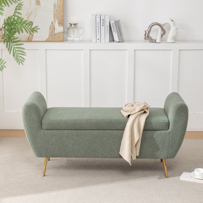 Create an accountThis storage bench tops off your bedroom or living room with plenty of glam style. It features a flip-top compartment that offers space for blankets, pillows, or other essentials. The seating capacity for two and the inclusion of arms make it a comfortable addition to any location in your home. In the bedroom, it can serve as a stylish addition at the foot of your bed; in the entryway, it's a convenient spot to sit and put on shoes. This bench rests on four flared, gold-finished metal legs, and it's wrapped in a bouclé-like fabric for lots of cozy comfort.