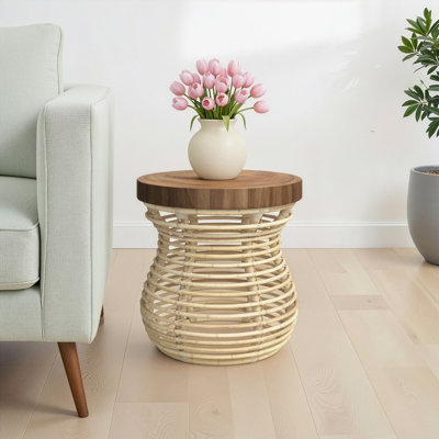 Create an accountThis end table shows off an eye-catching tulip-shaped silhouette and an open frame for an airy addition to your space. The circular top is crafted from solid wood with a noticeable grain variation, and the base is wrapped in rattan for a coastal farmhouse feel. Plus, the distressed appearance of this table adds texture and visual interest to your space. With a diameter of 19.7", there's plenty of room on top for an accent lamp and to keep a stack of coasters ready for drinks. No assembly required.