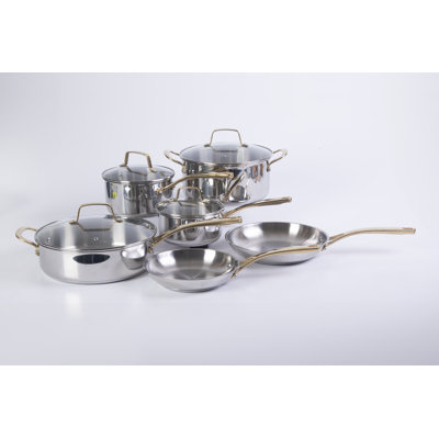 Create an accountWhile there are many different materials and finishes for kitchen appliances, and each serves their purpose, stainless steel has remained the go-to option for a reason. The metal heats evenly and quickly, producing a cooking experience free of guesswork and potential mishaps. Bring your entire kitchen up to this enviable level with the Castelle 10-piece Stainless Steel Cookware Set, a Martha Stewart offering that equips home cooks and their kitchens a beautiful and dependable collection of pots and pans. Constructed from 18/8 stainless steel, each piece has an impact-bonded aluminum base to promote uniform heat distribution to fry, sauté, sear, braise, and bake evenly. The pots are embellished with etched fill lines that make measuring liquids and servings an effortless task. They also come with vented, tempered glass lids to help monitor cooking progress and prevent boil-overs and messes. Safe to use on all cooktops, these pots and pans are designed to become your go-to cooking mainstays, whether you are tackling recipes from scratch or preparing make-ahead meals during busy weeknights. Built for style and function, this collection is safe to use on gas, electric, ceramic, halogen, and induction stovetops. The pots and pans are oven safe up to 450°F, while the glass lids are safe up to 350°F. Dishwasher safe. Embrace thoughtfully designed home essentials from America’s most trusted lifestyle expert, Martha Stewart. Step into her exquisite and iconic world filled with a curation of high-quality products to prep, cook, bake, serve, and enjoy. All crafted to elevate everyday homemaking and seasonal entertaining, these kitchen and tabletop pieces blend style and performance, inspiring avid hosts and home cooks to set stylish tables, serve up delicious meals, and create spectacular memories.