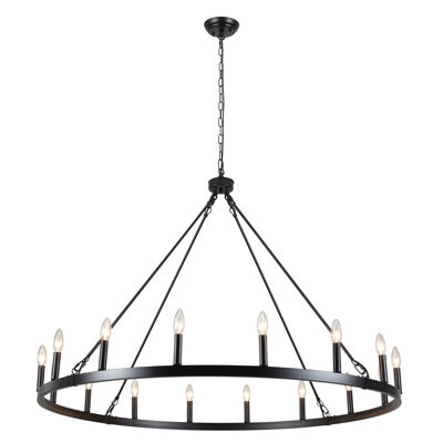 Create an accountThis 47-inch black large wagon wheel chandelier with a 16-light design that resembles a stylish wheel shape. High-heat baked lacquer gives a vintage smooth texture, making this black farmhouse chandelier durable. It offers a 360° illumination, creating a soft, warm ambiance without overpowering the space, adding a touch of modern elegance to any contemporary home.