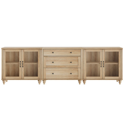 Create an accountThis spacious sideboard adds some extra storage space and farmhouse style to your dining or living room. Crafted from a blend of solid and engineered wood, it features a distressed finish that complements your cozy and classic decor. With interior shelves, including adjustable ones, there's plenty of space to keep your kitchenware and daily essentials neatly stored. The four glass doors and middle drawers offer dust protection and easy visibility, while the cable management holes at the back help keep cords tidy. Plus, there's room on the surface for a few appetizer trays, cutting boards, and accent pieces.
