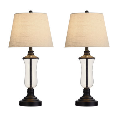 This set of two 30" tall table lamps helps cast some warm light throughout your living room or bedroom. Each accent lamp is made with a clear glass base that has antique bronze accents for that antique look you love. It also has a white Empire shade that diffuses the light from a single 100W bulb, which you'll need to buy separately. The best part of all? This table lamp set comes with a 3-way rotary switch for easy off and on.
