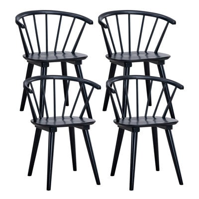 Create an accountArriving as a 4-piece set, this armchair enhances your dining room with elegant, contemporary flair. It features a classic Windsor-inspired design that consists of a curved silhouette and angled spindles for a dynamic modern touch. Crafted from solid rubberwood, it comes in a sleek, stain-resistant black finish to round out the look with a flourish. Each chair in this set accommodates 300 lbs. Why not add your favorite patterned cushions for extra padding as you enjoy coffee and dessert?