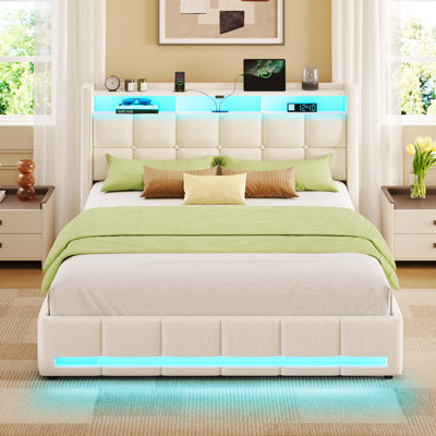 Create an accountThis upholstered platform bed frame features a distinctive wingback headboard and multifunctional dimmable design, showcasing modern style and greatly enhancing the room's aesthetics. The soft backrest provides extra lateral support, ensuring comfort for your head, neck, back, and shoulders. The headboard includes two tiers of shelving for conveniently storing phones, books, headphones, and more, along with 2 USB ports and 1 Type-C port for easy charging of your phone and tablet. The bed frame supports LED lights on both the headboard and footboard, offering 60,000 color options and 3 dynamic modes to create a romantic nighttime atmosphere. This bed frame is an excellent choice for both its visual appeal and functionality.