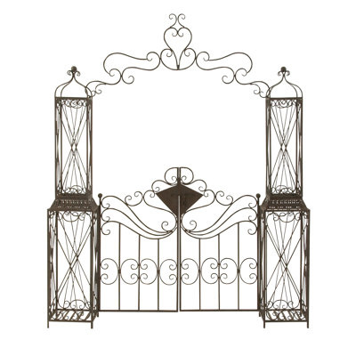 Create an accountA creative way to add a welcoming look with bold design into your outdoor setting. This garden arbor is perfect for creating a focal point over in your outdoor patio space. Place the scroll garden trellis for climbing plants in patios or gardens to elevate aesthetic appeal and functionality. Elevate your garden or lawn with this metal pergola arbor featuring a latch lock gate with scroll designs. Suitable for indoor and outdoor use. Some assembly required. This is a single bronze colored garden gate. Traditional style.